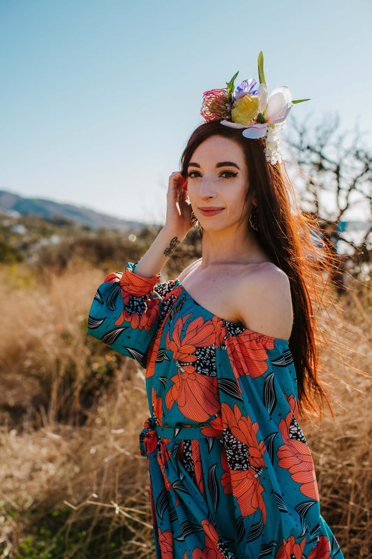 Sweet Tropical Burst- BELANGE HANDMADE x SHEIN - Boho Bohemian Position Print Ruffle Tiered Sleeves Off Shoulder Smocking Shirred Top- Available on SHEIN.COM Only