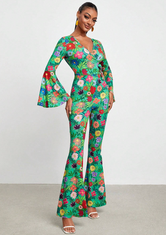 BELANGE HANDMADE X SHEIN - Autumn Floral Print Flare Leg Jumpsuit- Available on SHEIN.COM Only