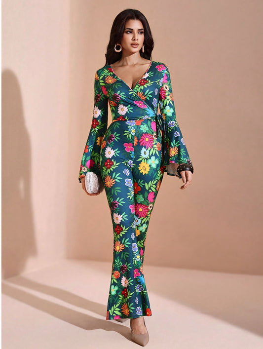 BELANGE HANDMADE X SHEIN - Floral Print Flare Leg Jumpsuit- Available on SHEIN.COM Only