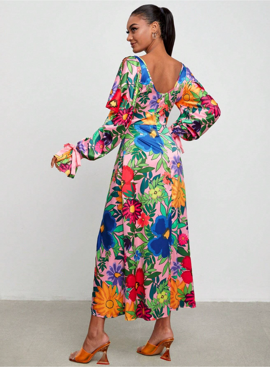 BELANGE HANDMADE X SHEIN - Floral Print Flare Sleeve Split Thigh Dress - Available on SHEIN.COM Only