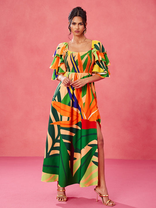 Sweet Tropical Burst- BELANGE HANDMADE x SHEIN - Boho Bohemian Multicolor Print Smocked Shirred Bodice Tiered Ruffle Sleeves Slit Maxi Dress- Available on SHEIN.COM Only