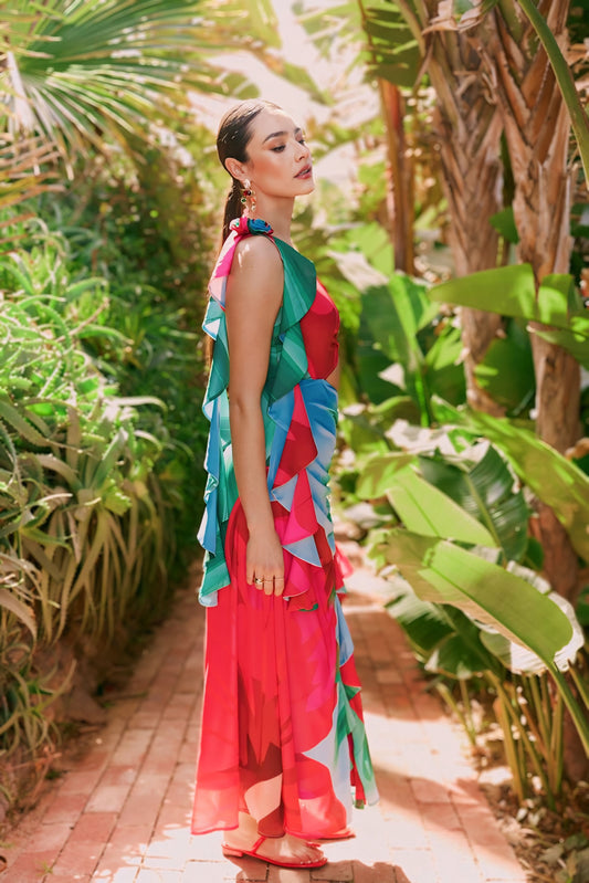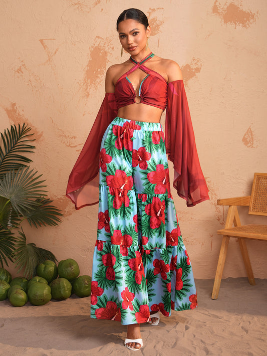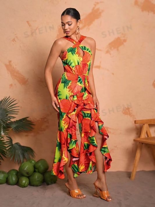 BELANGE HANDMADE X SHEIN - Full Print Halter Neck Wide Leg Jumpsuit With Slit And Ruffle Hem- Available on SHEIN.COM Only