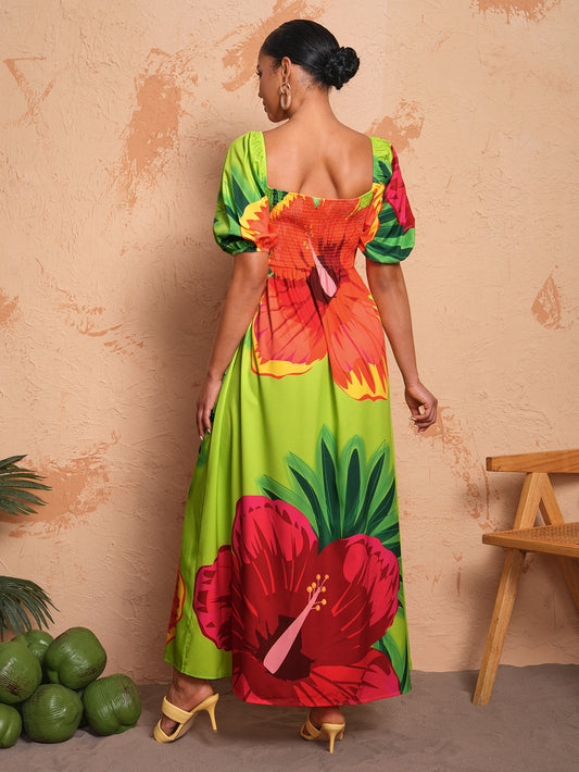 BELANGE HANDMADE x SHEIN - Summer Casual Floral Print Bubble Sleeve Dress With Square Neckline- Available on SHEIN.COM Only