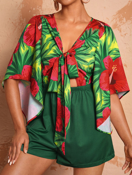 BELANGE HANDMADE X SHEIN - Vacation Style V Neck Floral Print Wide Leg Jumpsuit With Flared Sleeves And Cut-Out Shoulders- Available on SHEIN.COM Only